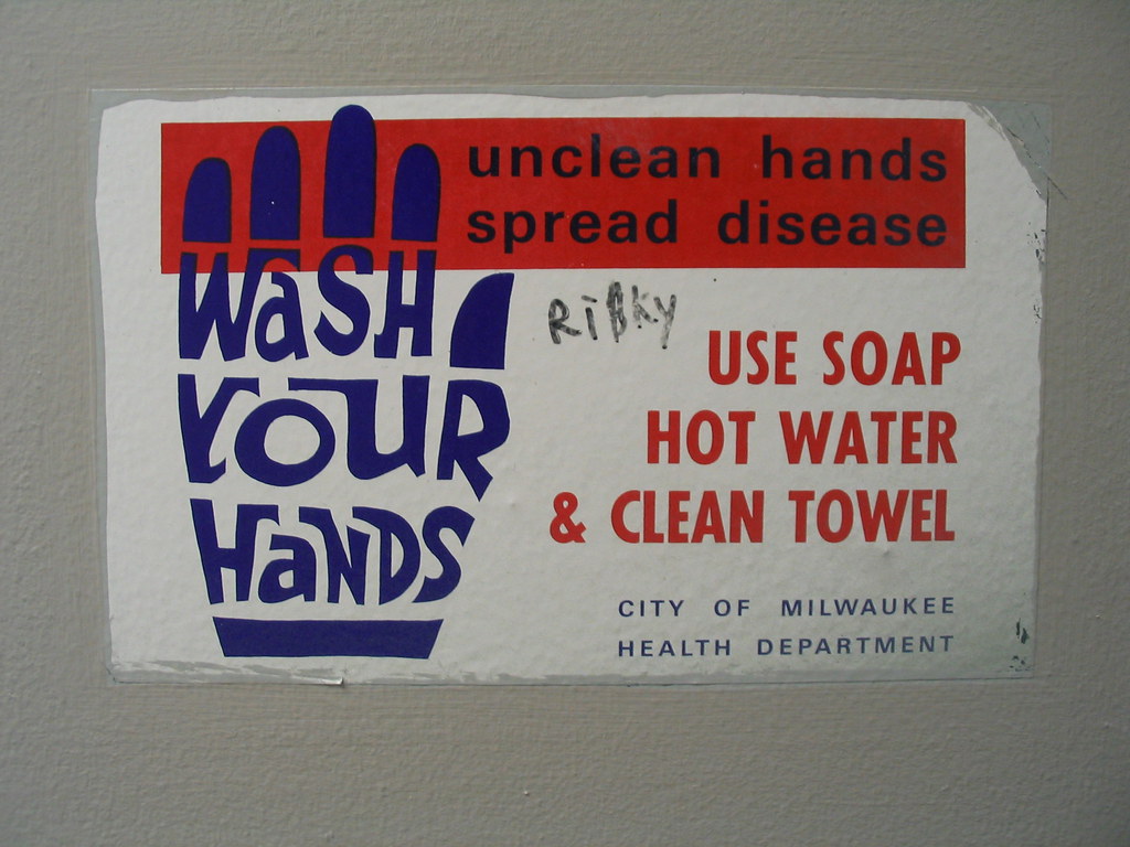 Within an hour, one of my co-workers arrived, also named Chris and also Stan’s grandson. Two years older than me, this other Chris had worked there for some time; as Stan left to go home for dinner (he also lived in the neighborhood), his grandson would continue my training. The other Chris was fun because he was a smartass and a co-conspirator. That first evening, when it came time to get ready for closing, he showed me the bathroom in the back where I’d prepare the mop to clean the store’s tiled floors. Next to a rusting sink and a mirror desperately in need of a streak of Windex was a slightly cracked sign from the Milwaukee Health Department: in funky, early ‘70s-style lettering, it said “Wash Your Hands,” the words actually rendered within the shape of a hand. Directly underneath it, a plastic shelf held a yellowed, dusty bar of soap.