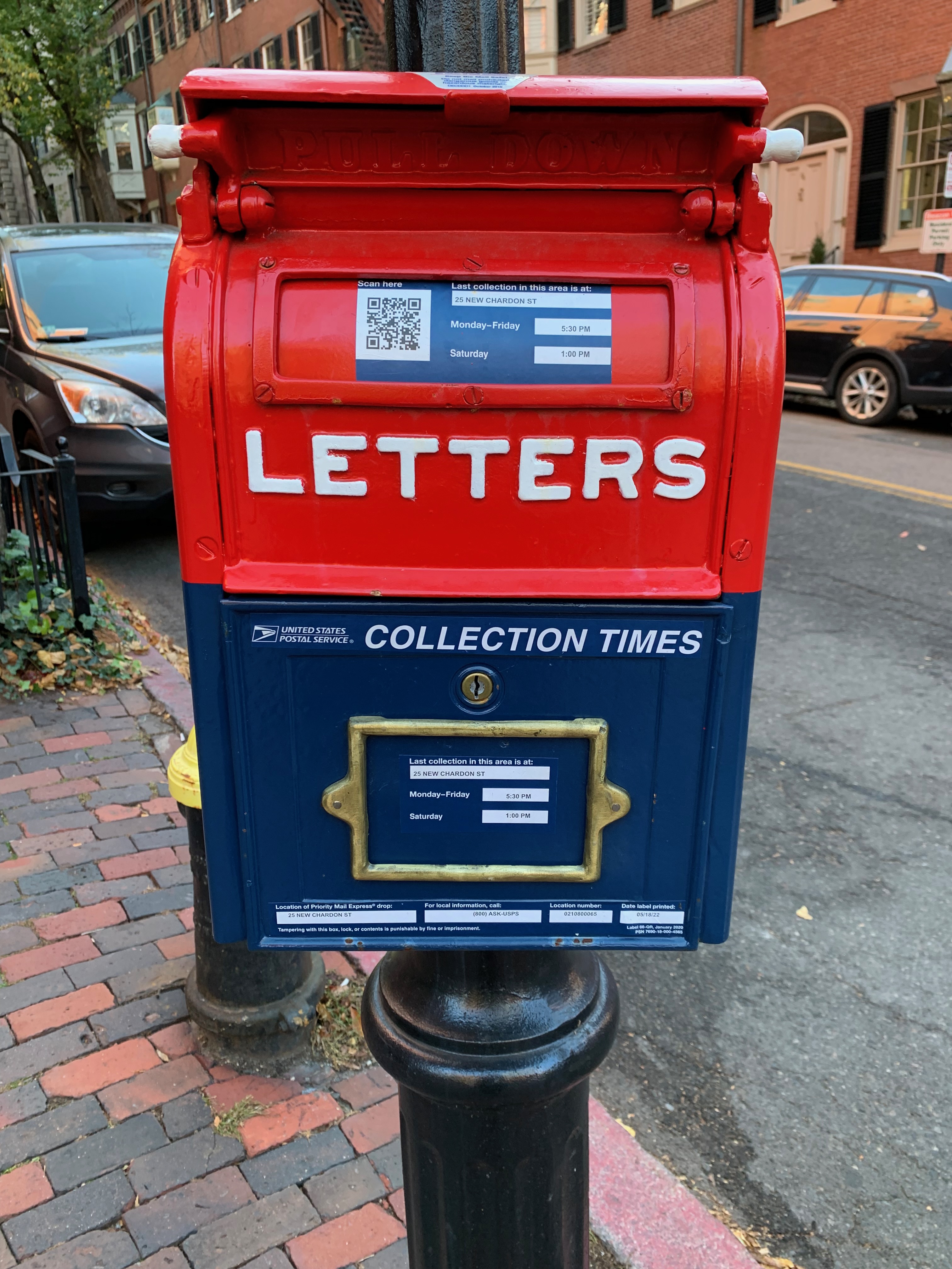 We begin in Louisburg Square, arguably the toniest enclave of Beacon Hill, the city’s toniest neighborhood. I don’t remember this old-fashioned mailbox always being there although it’s possible someone may have recently painted or gussied it up. Sitting along old row homes and cobblestone sidewalks, its antiquity fits right in.