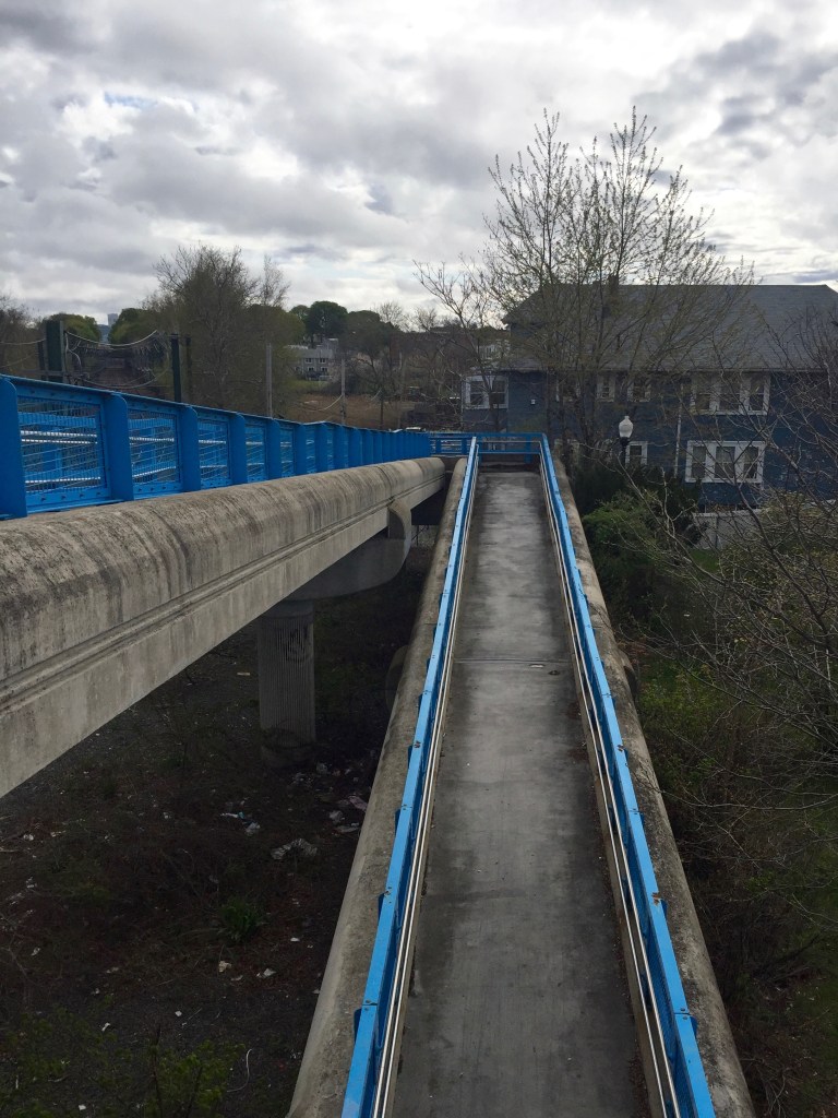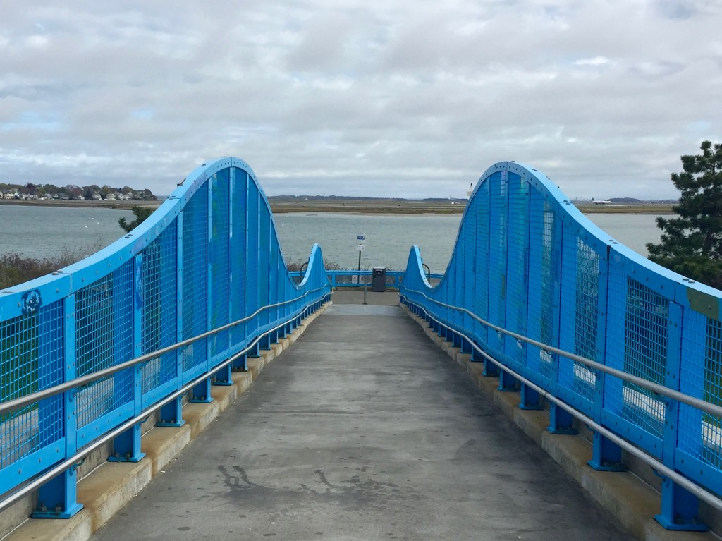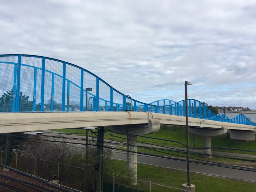 Getting there required crossing the Blue Line MBTA tracks via this suitably blue-lined overpass.