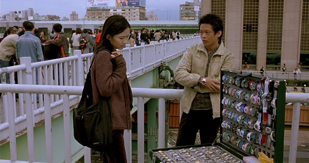 Lee’s approach to mourning is more difficult to parse. The persona Tsai crafts for him throughout the director’s oeuvre is that of a stone-faced onlooker, like a more passive Buster Keaton (perhaps without the acrobatic comic timing.) Initially, his grief doesn’t seem outwardly apparent at all except through quirky acts of behavior such as repeatedly urinating into a plastic bag or a water bottle in his bedroom rather than using the bathroom (no concrete reason is given for this as far as I can determine.) He makes his living selling wristwatches, often standing on the street with a giant open suitcase of his merchandise, repeatedly and almost robotically banging a single watch against the metal railing behind him to draw attention. After much haggling with a young woman (Chen Shiang-chyi) over his personal wristwatch (which belonged to his father), he agrees to sell her it after she discloses she’s about to take a trip to Paris.