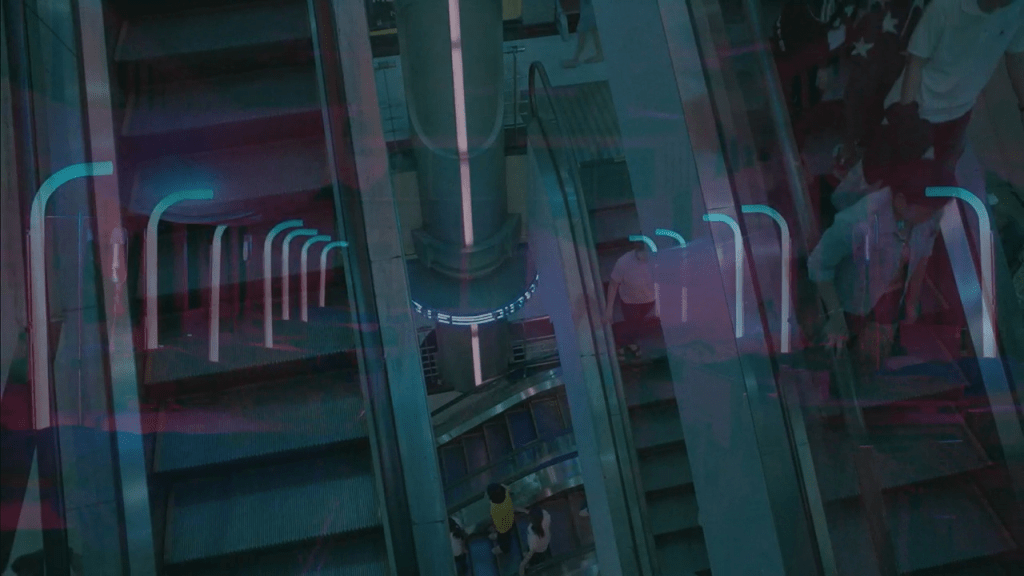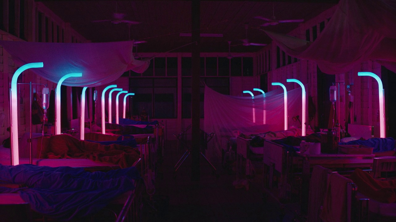 The tubes also play a role in one of the film’s key sequences. In a rare instance where Itt is fully awake, he and Jen leave the hospital for an evening trip into the city: dinner at a street market and a movie (we only see them watching a trailer for an over-the-top, CGI-heavy action/horror epic—the antithesis of Joe’s style.) After the trailer ends, as seen in silhouette, Jen, Itt and the rest of the audience stand up in the dark, silent, still staring at the screen as if in a trance (much like the viewer of one of Joe’s films, perhaps.) Everyone then leaves the theater in what appears to be a modern multiplex, walking towards a sea of escalators that will take them back to the outside world. There’s no score, only diegetic sound but as patrons get on the escalators, some familiar, slowly changing colors appear. They’re from neon lights in the building’s interior design. Soon, we also see a recognizable ceiling fan as part of an exceedingly slow crossfade. The escalator riders are still visible, but the hospital room with the glowing neon tubes also comes into focus.