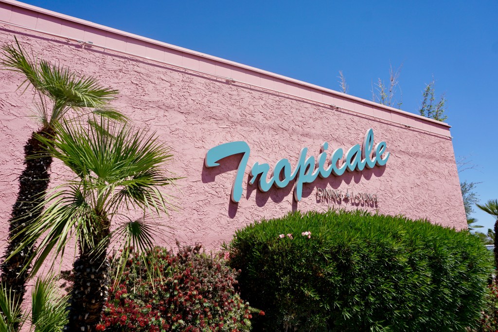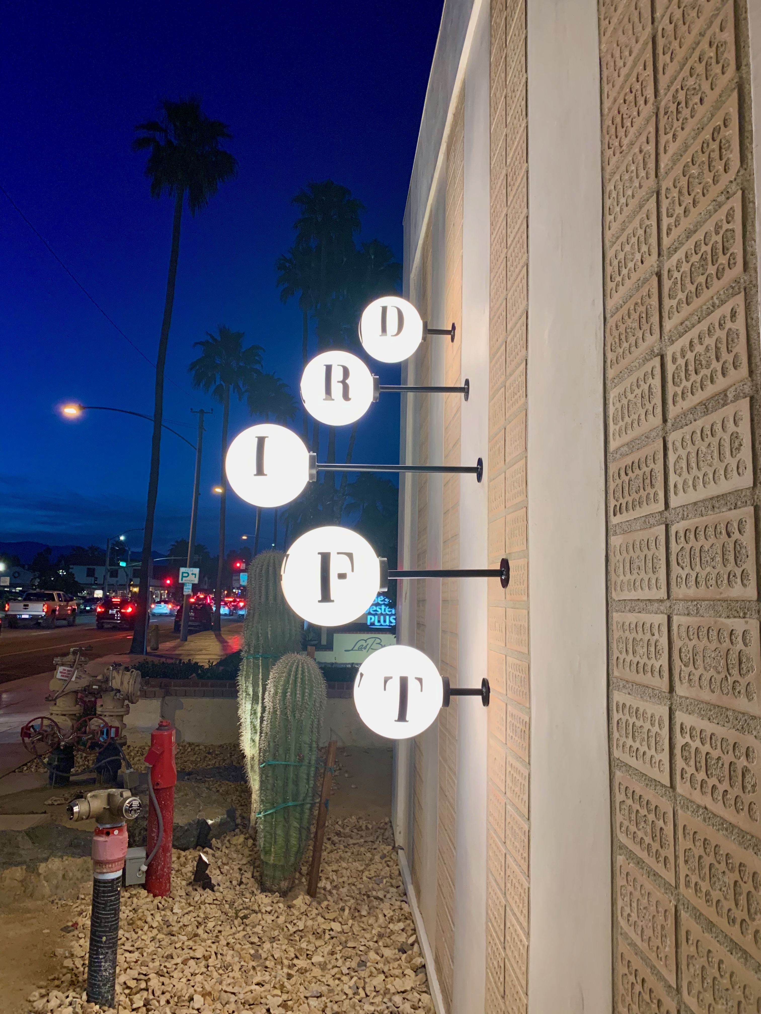We end with this lovely hotel sign on Indian Canyon Road just after sunset. The globe lights, their whimsical placement, the font, the brick-like wall textures, the cacti–together, they practically sum up what I love about Palm Springs Mod (and the town in general.)