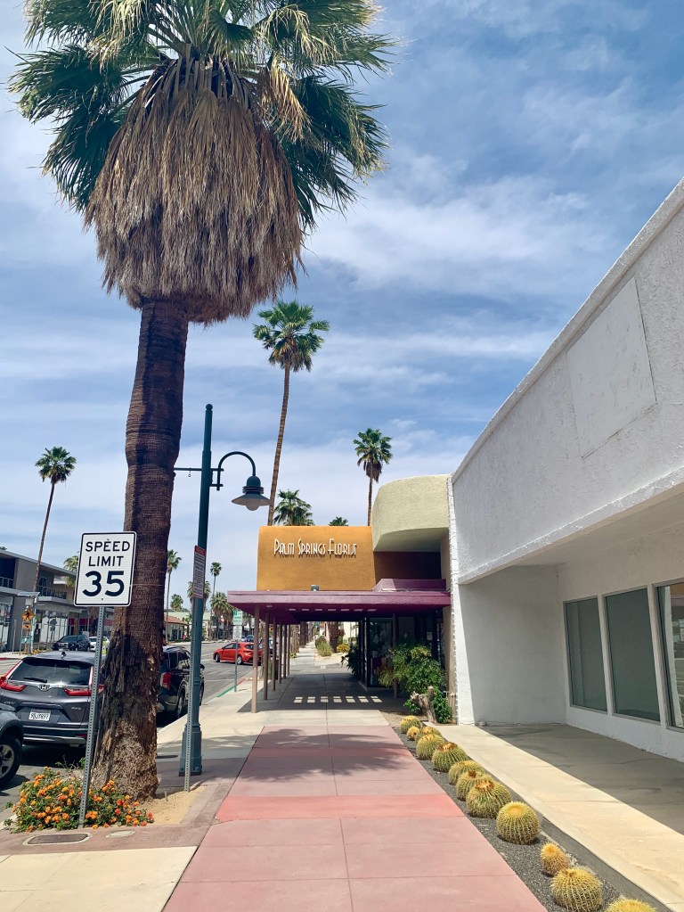 Facing North on Palm Canyon Drive in the Design District, which would not be complete without an art deco florist (or a row of cacti.)